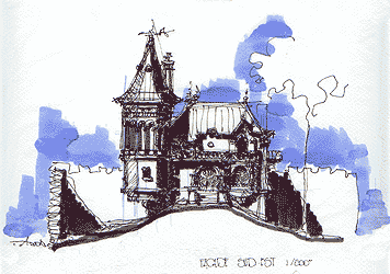 This is the Final Version of the small Castle. This is the Main Face Elevation with a central stair, one bow-window on the right, a turret on the left and a balcony upstairs...