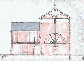 On this Longitudinal section you understand better the center space with the light coming from the roof, the stairs on its left part. You can also see the TV Room upstairs, the chimney and its rest room at the bottom of the living room...