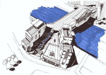 This is the opposite view of the Bridge. As you can see, there's a fountain in the central part of the Bridge Stairs. At the Bootom of the Stairs, you can also see the Shop spaces... The uildings all possess their terraces and balconies at the top floors.